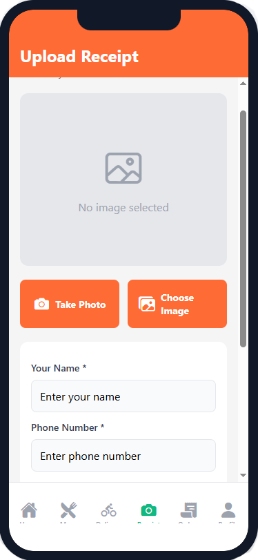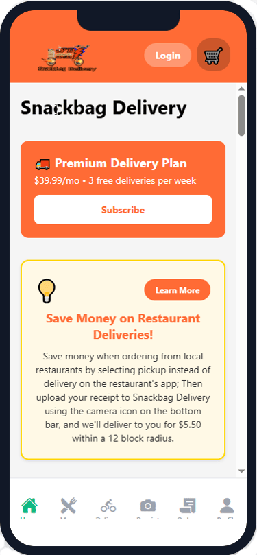 As a Premium subscriber, three times a week choose the pickup option when ordering from local fast food, and restaurants; Opting out of the delivery charges at the restaurant. Then upload your reciept using the camera icon on the bottom, and Snackbag will go in your stead using your reciept to pickup your order while you avoid delivery charges! Saving money with us!!!
